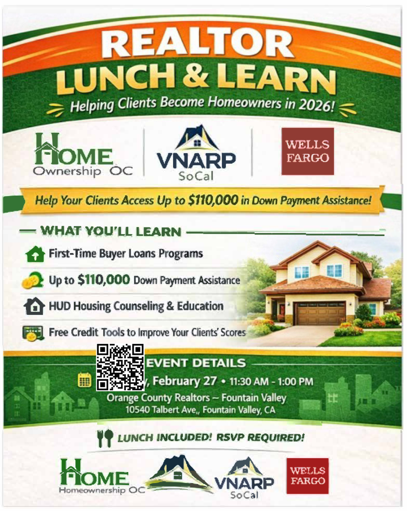 This in-person “Lunch & Learn,” held on Thursday, February 26, 2026, at the Orange County REALTORS facility in Fountain Valley, provided local real estate professionals with the tools, knowledge, and actionable resources needed to help clients snag their dream homes in a challenging market.